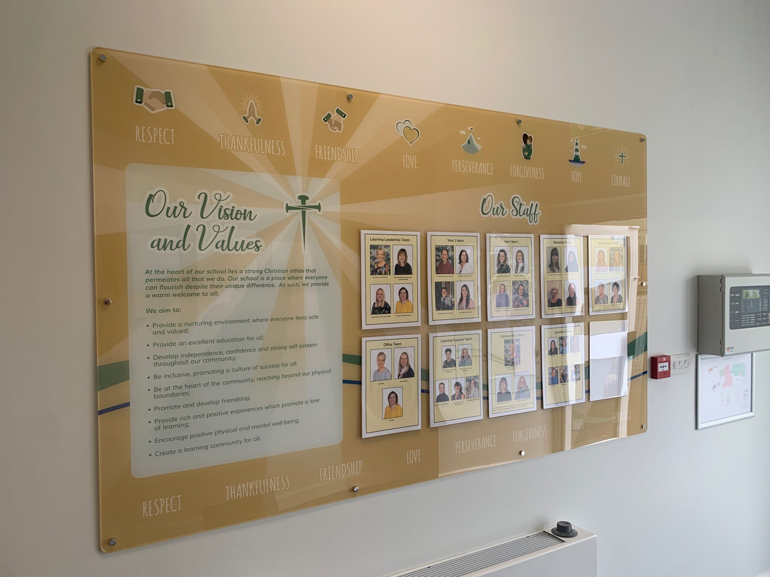 The end result: A welcoming installation that reflects its Distinctive Christian Vision, and showcases pupils work to visitors and parents alike.