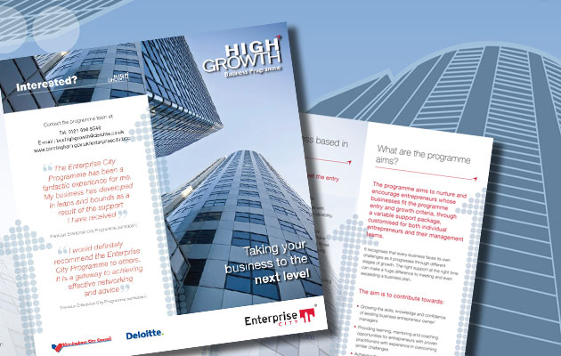 A project encompassing the branding, design and delivery of promotional items to support the City High Growth Programme, which contributes to Birmingham’s entrepreneurial culture and the development of local wealth and job creation.