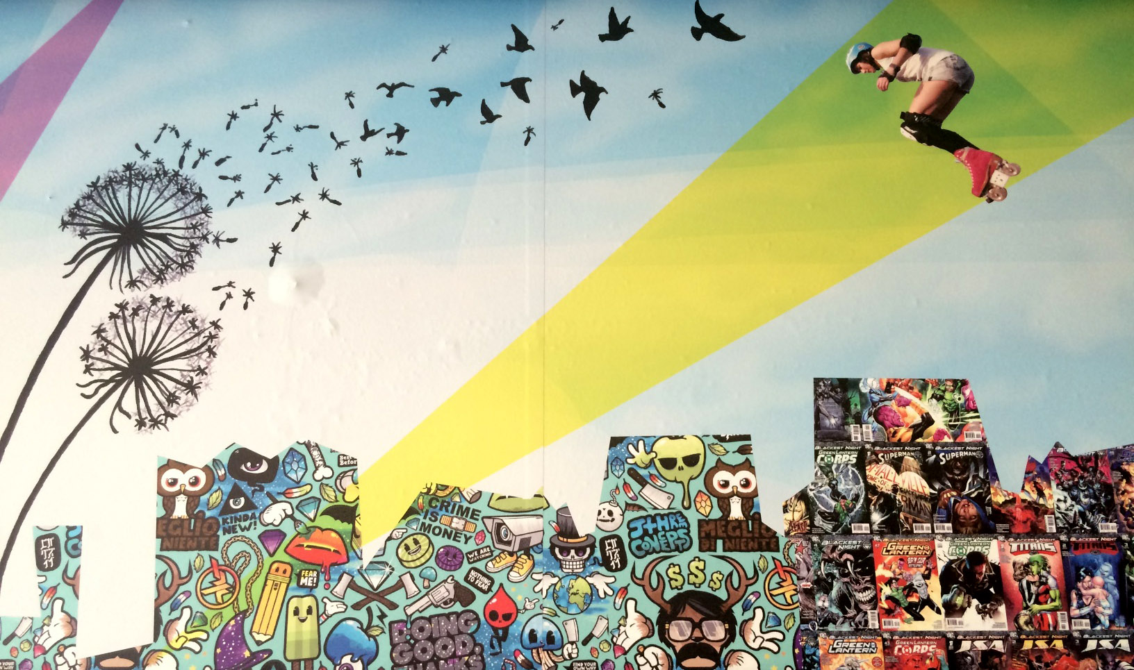 The end result: The creation of a permanent montage using the latest hard wearing self adhesive wallpaper, aimed to inspire pupils to read and use the library space.