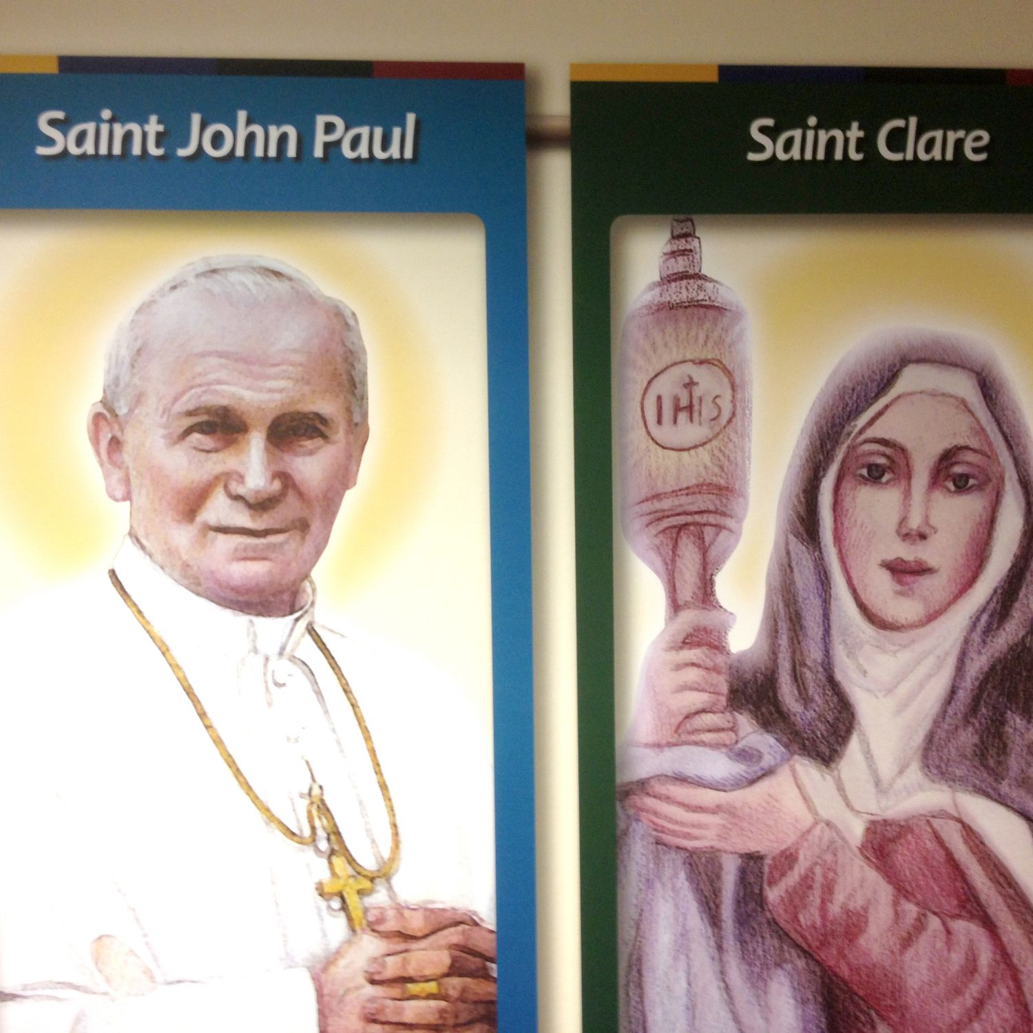 The brief: To create a saint display in the primary school’s entrance area that contains the school’s house saints (St. Clare, Pope John Paul II, St. Christopher, St. Martha) as well as the Academy Saint (St. Nicholas Owen). To produce a Mission Statement display in the school hall that creates a frame for the stage and a backdrop for assemblies.
