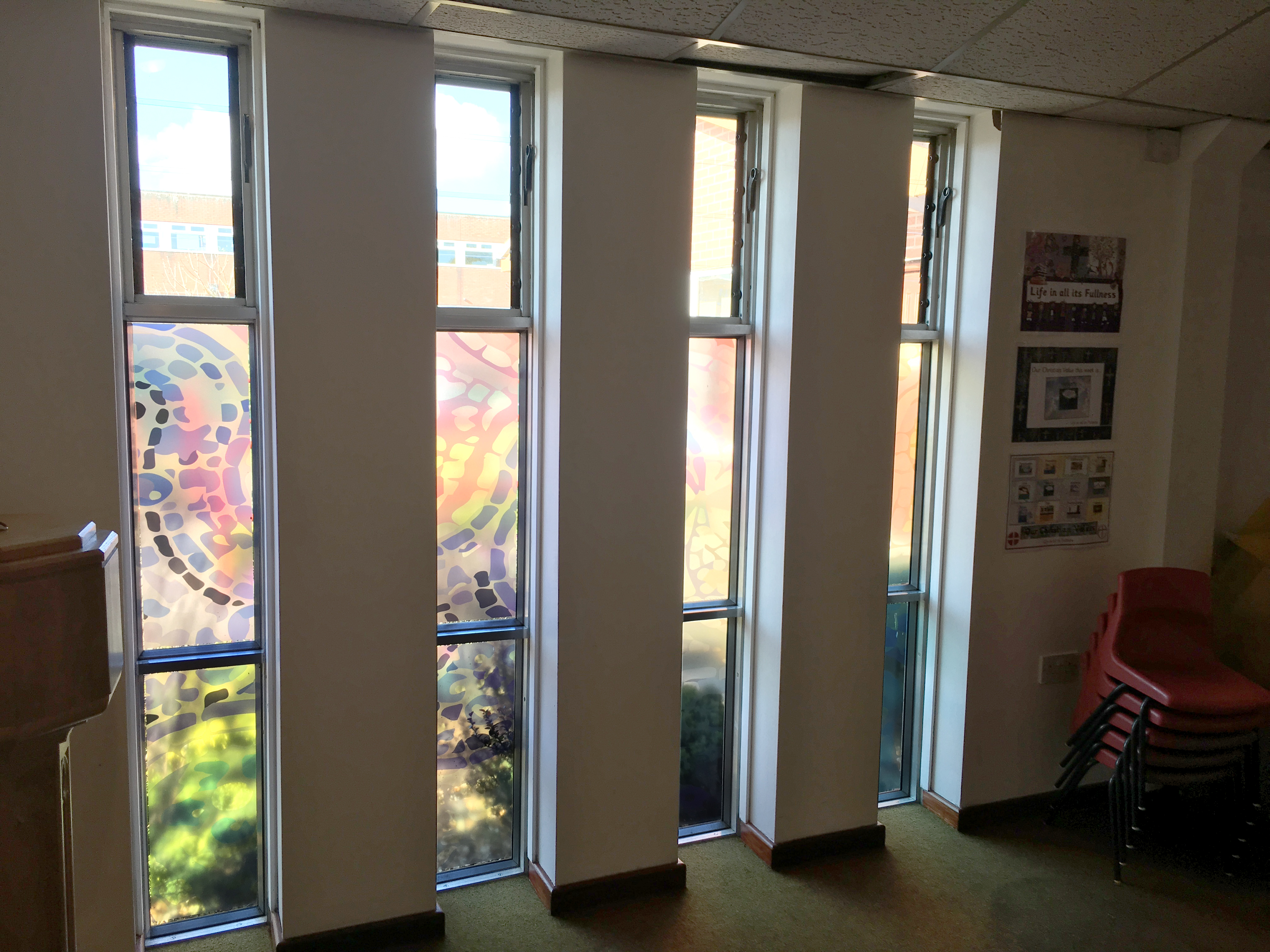 The end result: The Prayer Tree was created with reverse printed acrylic cut to shape with clear acrylic hooks adhered to the face, ready for the pupils to add their prayers/notes too. The external windows had transparent window vinyl installed to the internal side of the glass. An acrylic display board was fitted with chrome stand-offs to the Chapel side of the arched windows.