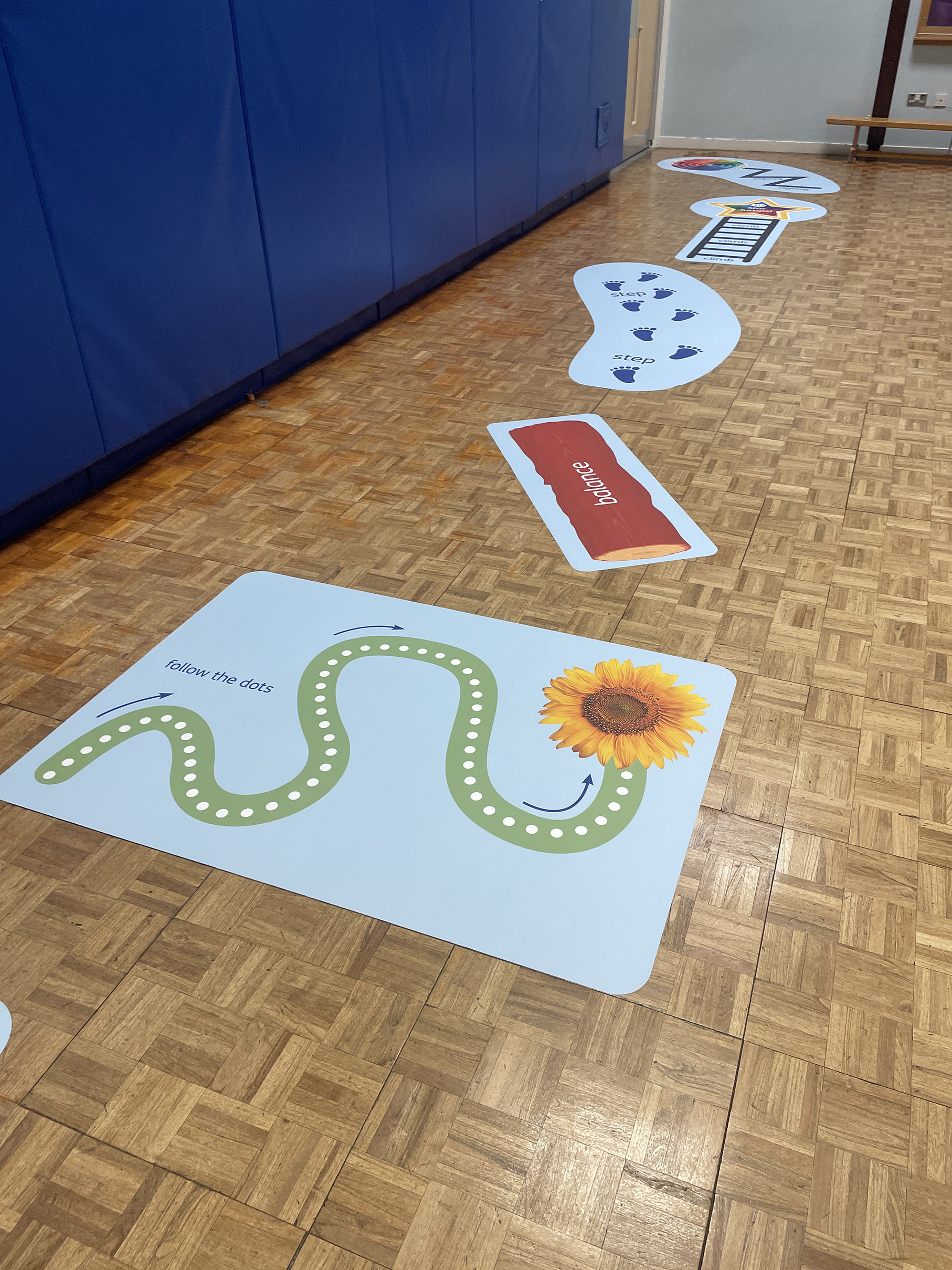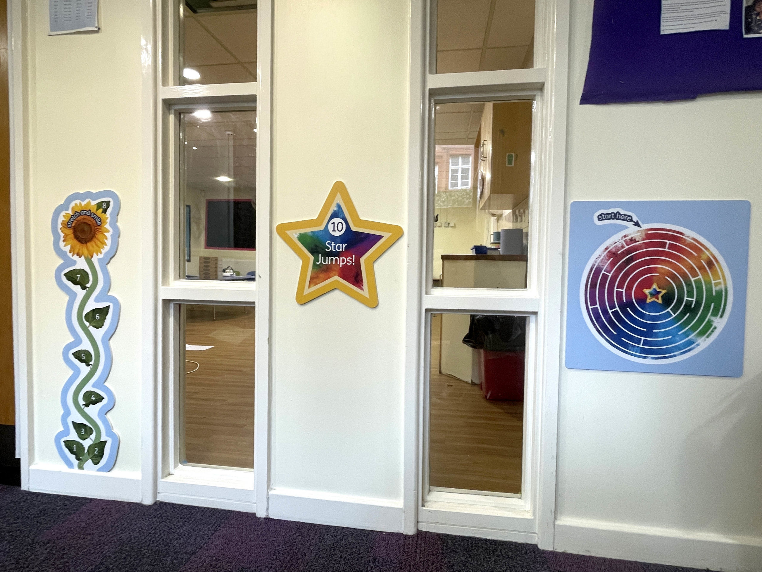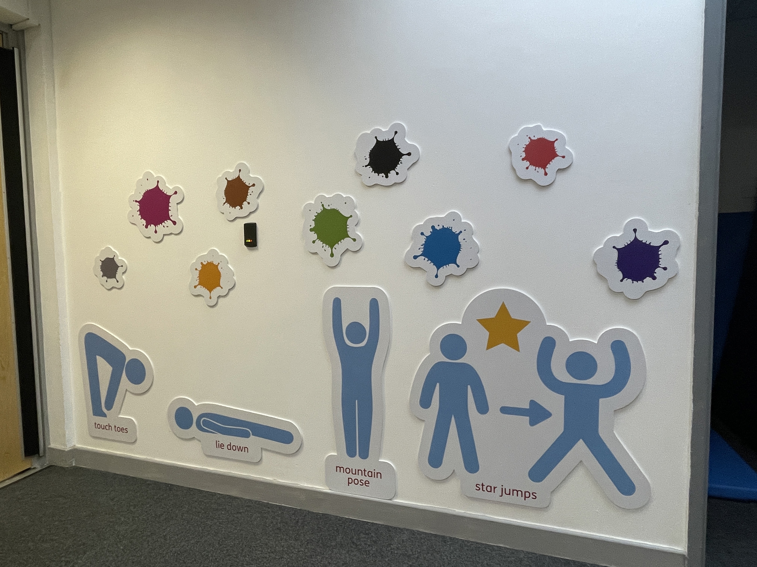 Sensory Wall Activities – playful prompts such as find a colour, hit a splat, reach down low and up high, star jumps and spins encourage active movement and engagement.