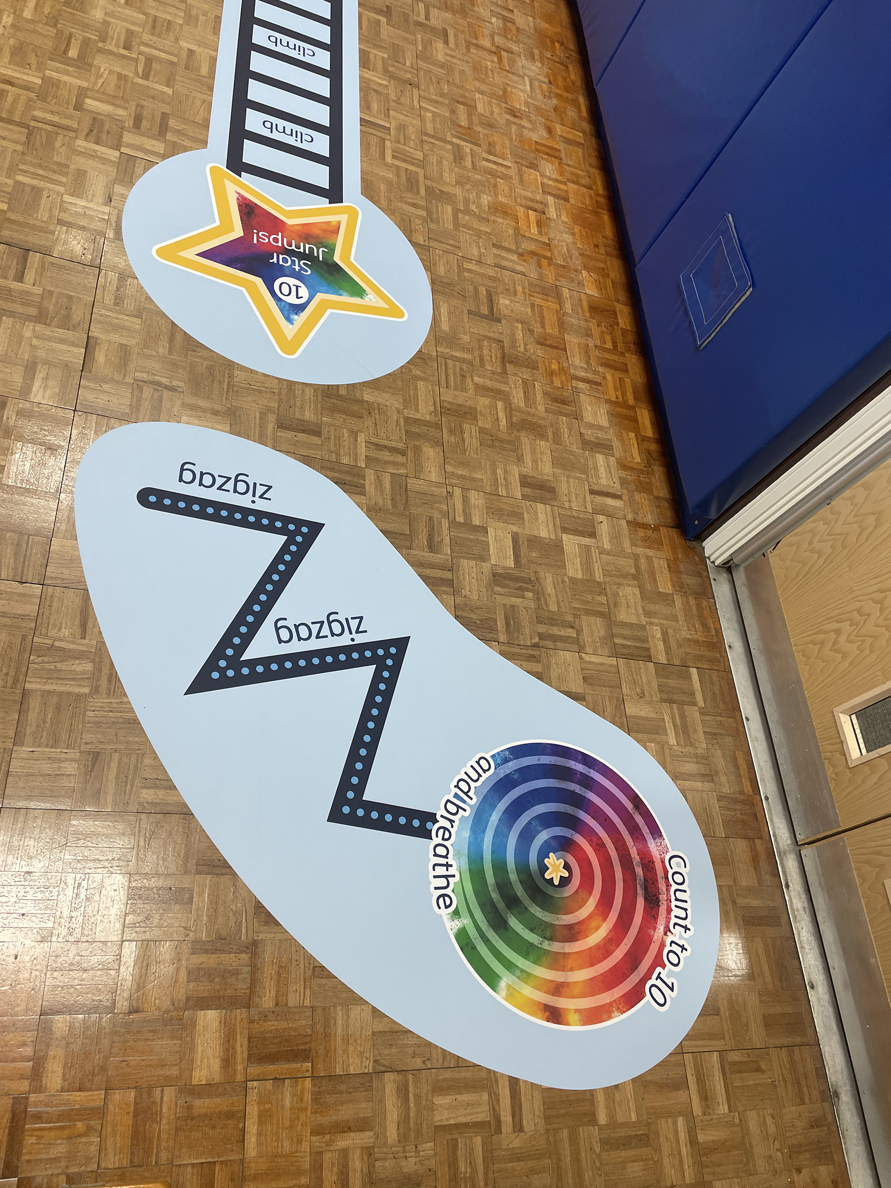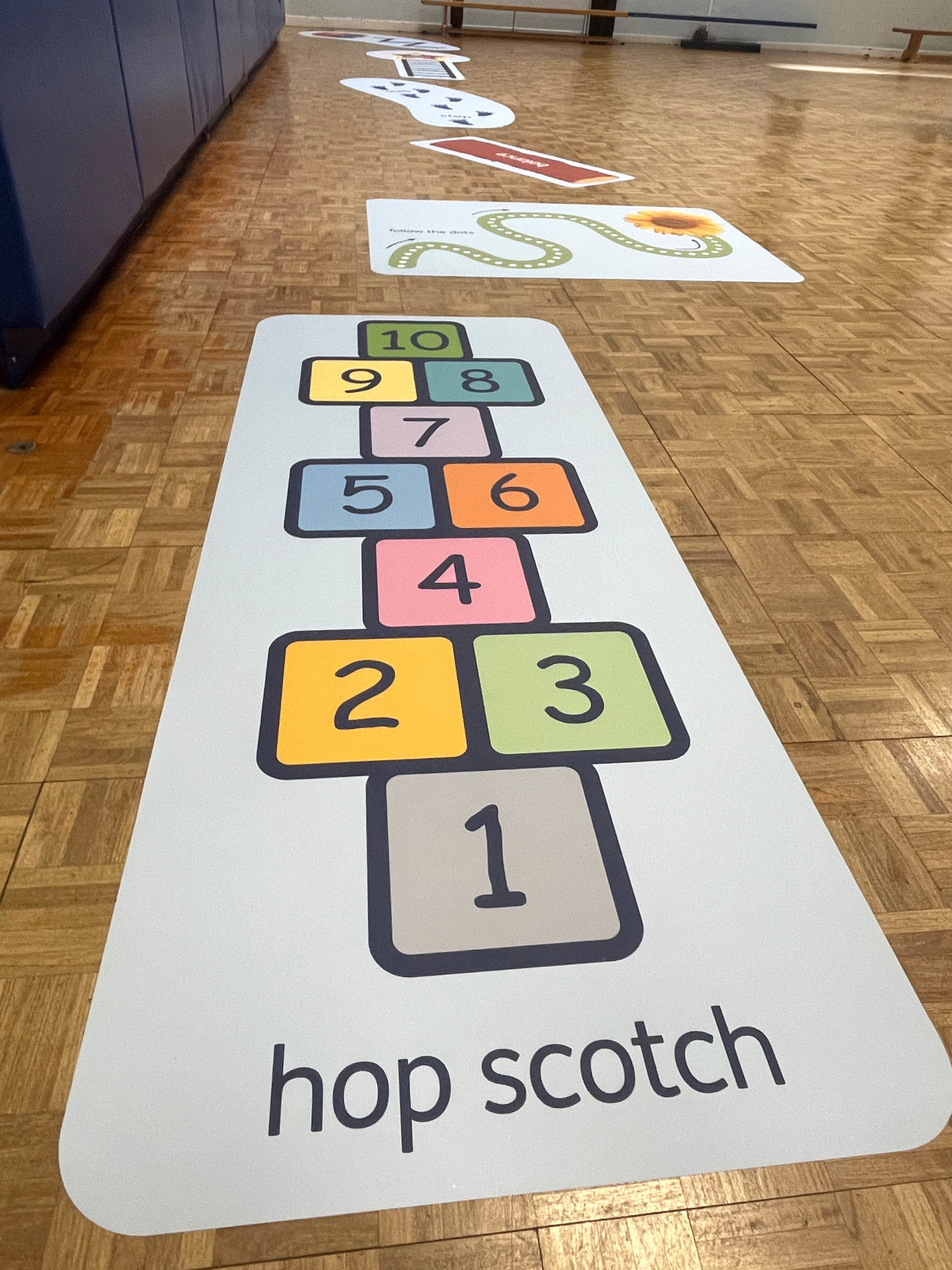 Main Hall Hopscotch Trail – a bright, durable floor graphic encouraging physical activity and coordination while adding a playful energy to shared spaces.
