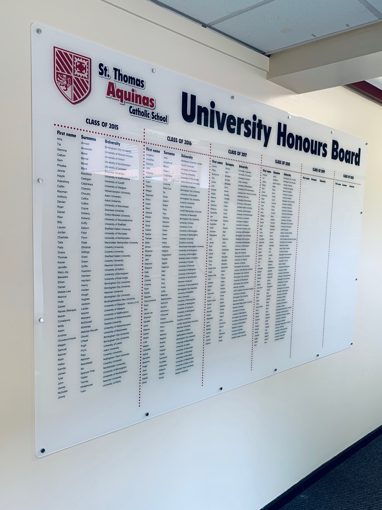 Client St Thomas Aquinas Secondary SchoolServices Installation, Interactive, Print & Design Materials acrylic, adhesive wall vinyl, snap frames Tags illustration, info graphics