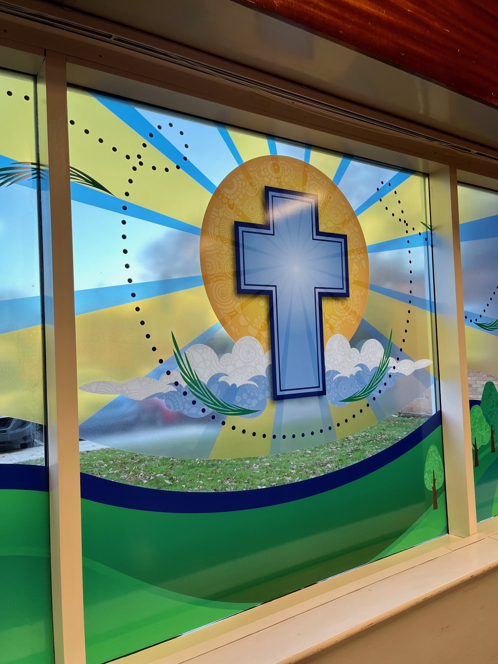 The end result: Stunning hall window vinyl display, when viewed from both inside and out. Complete reception and entrance transformation using the Catholic Virtue and Values word pairing. School signage, office windows and reception hatch frosting.