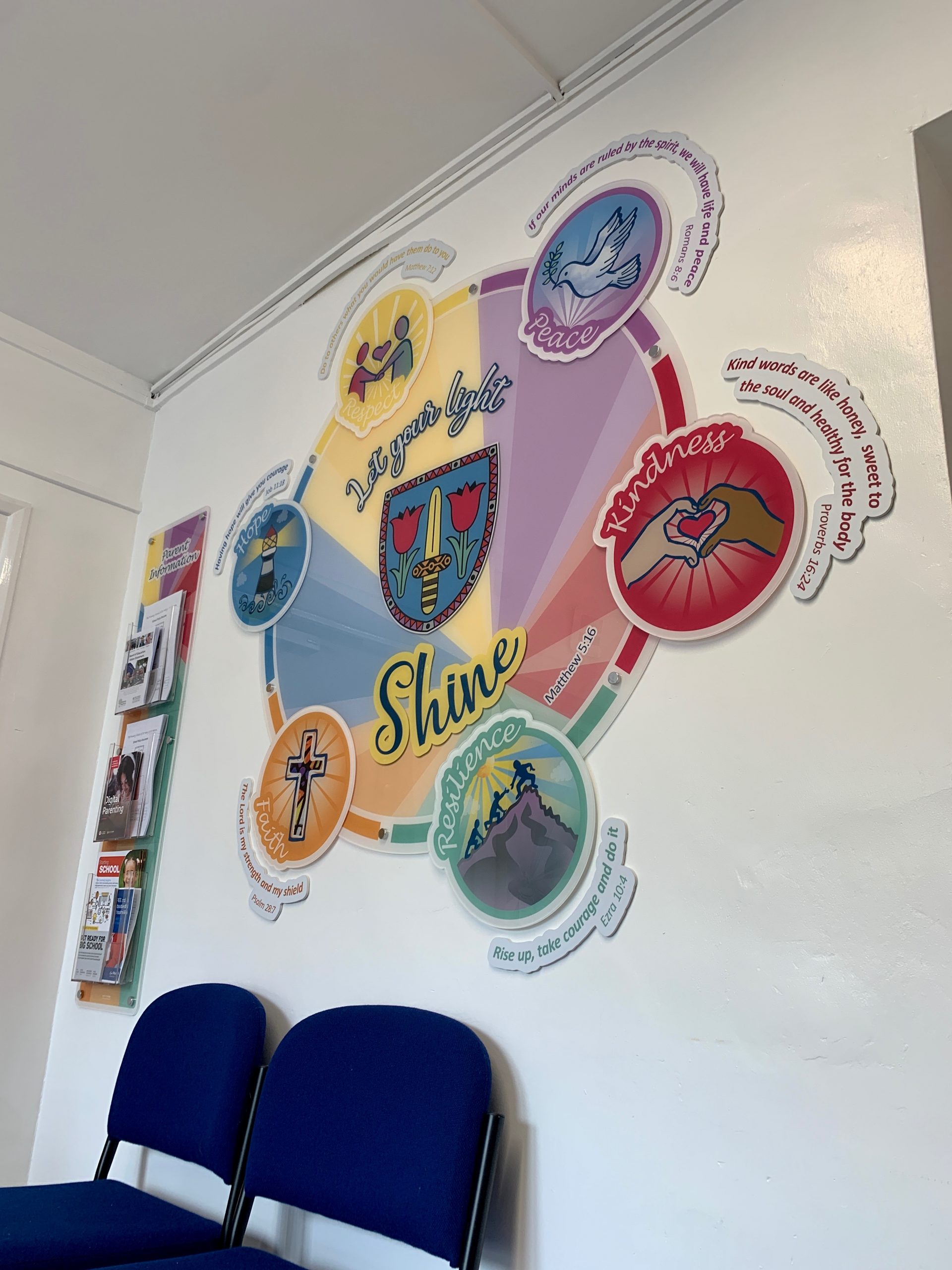 The end result: The cohesive theme helps the whole school in living out its Distinctive Christian Vision and welcomes visitors. With update-able and permanent display for pupils and faith focal point in the hall.