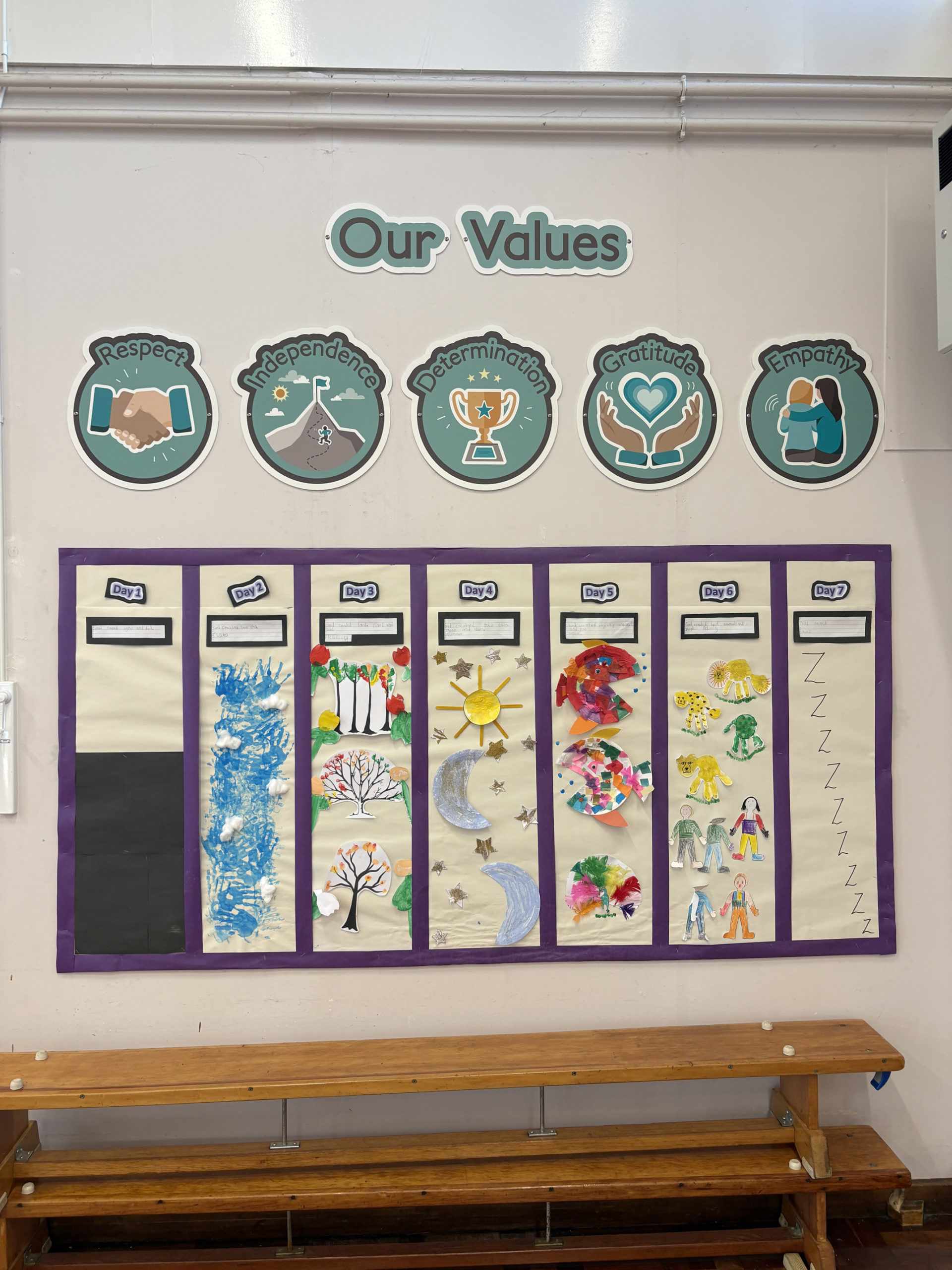 Foamex plaques featuring the values were also installed in the school hall, forming a bold, permanent display that ties the message together throughout the school.