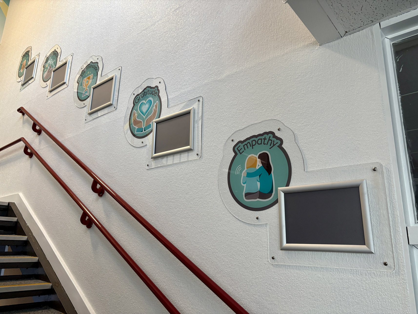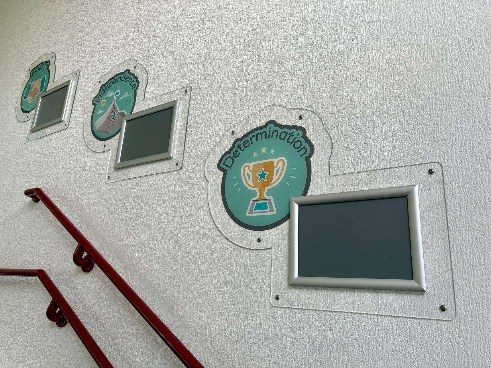 A durable, updatable display was produced using printed acrylic panels and snap frames, allowing staff to showcase pupils’ work, photos, and certificates — actively celebrating values in action.