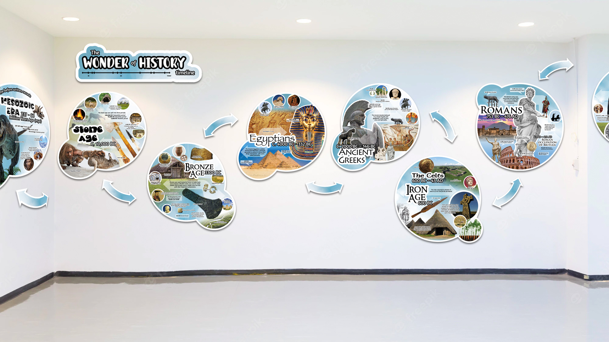 The display can be created from the 14 Era boards, arrows, title and/or the Timeline board: